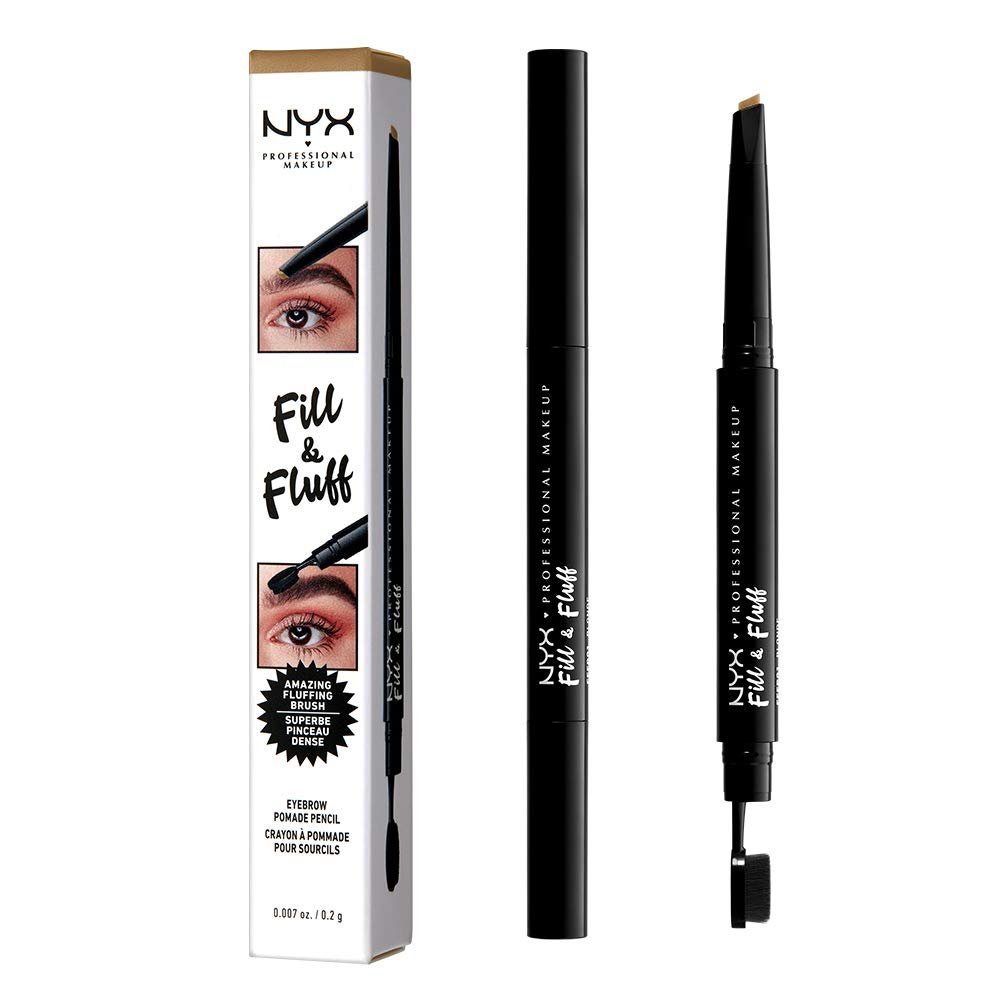 - FILL & FLUFF EYEBROW POMADE PENCIL: This NYX Professional Makeup brow pomade pencil features a teardrop shaped tip on one end for drawing precise eyebrow hairs, shading & filling eyebrows plus a micro paddle brush on the other for blending