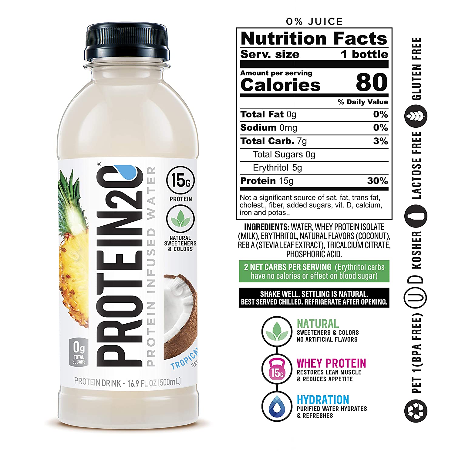 - Provides all 9 essential amino acids and has a Protein Digestibility Amino Acid Score (PDCAAS) of 1.0, the highest quality score a food protein can have.Ingredients: Tropical Coconut: Water, Whey Protein Isolate (Milk), Natural Flavors (Coconut, Pineapple), Gum Arabic, Medium Chain Triglycerides, Sucralose, Calcium Citrate